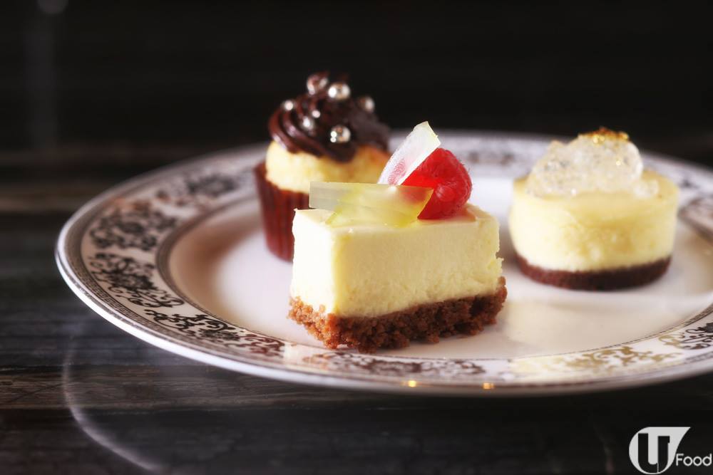 (左)杯子蛋糕伴朱古力忌廉、(中)香檳芝士蛋糕伴檸檬軟糖、(右)白朱古力慕絲蛋糕伴金箔啫喱