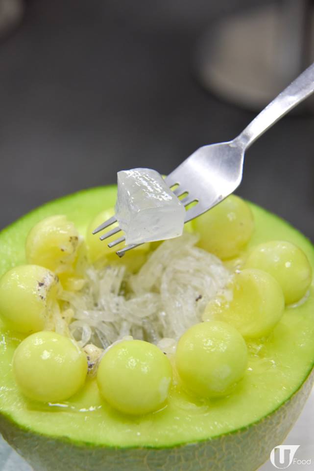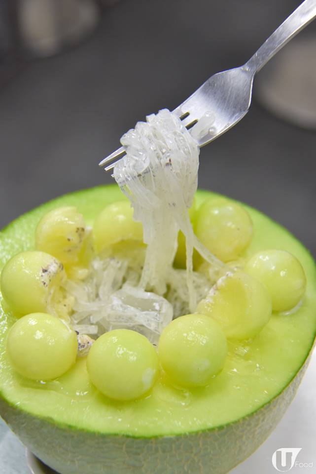 食晒頂層嘅雪糕蜜瓜,見到入面放咩喇!原來甜品師將蜜瓜挖空中心後,放入爽彈嘅水晶粉條。不過水晶粉條無乜味道,建議大家留少少雪糕伴食!