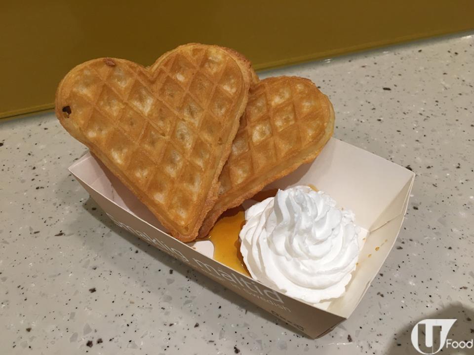 一式兩件心形窩夫餅,打卡必備;沾焦糖漿和鮮忌廉吃,滋味。