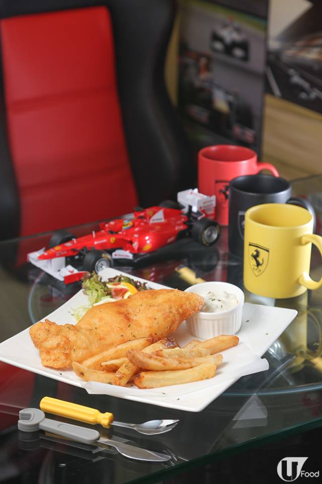 食物為配合主題,以烤焗的西式肉食為主,如燒牛肋骨、燒春雞、炸魚薯條等,也少不了沙律、薄餅、意粉、甜品等,共廿多款,由五星級酒店西廚 Sam 哥主理。兩磅重的燒牛肋骨,是每枱必點的招牌菜,因為大份夾抵食!用上美國 Prime Grade 穀飼牛肋骨,收到柯打,才用百里香醃一醃,放進焗爐燒至 medium rare,蘸上用牛骨、紅酒熬成的燒汁,更加 juicy,難以相信只賣 $138!大廚在肉食菜式都配上好多蔬果,唔想食肉咁 heavy,亦可試呢度的炸魚薯條或者 pizza,也做得有驚喜。飲品 menu 可找到老闆的飛佛,3 款用跑車牌子命名的特飲,包括林寶堅尼、法拉利、麥拿倫,配嘢食一流!