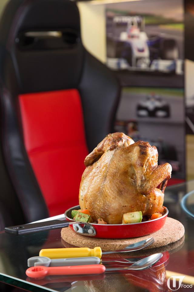 用上原隻重近 1kg 的法國有機春雞,醃上一日,收到柯打才裝上直身架焗 15 分鐘。皮薄肉嫩,底下有好多新鮮番茄、翠玉瓜等新鮮蔬菜。