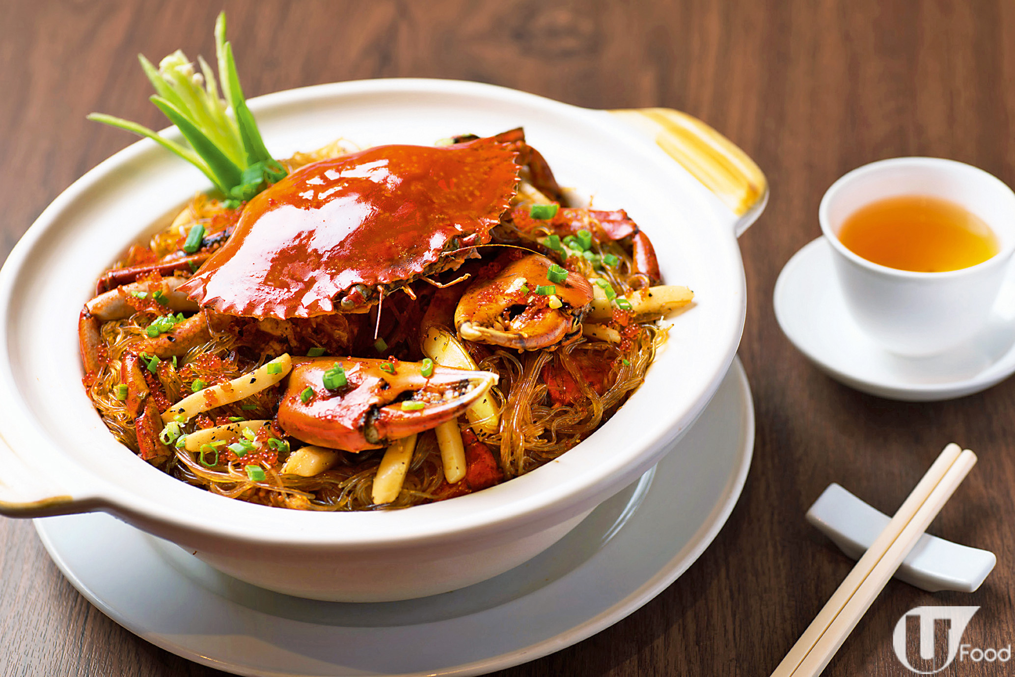 約一斤重的肉蟹洗淨走油,加入以南乳和黑椒調味的日本葛粉絲、粉絲及韓國年糕,用高湯連同肉蟹一併烹煮,口感豐富之餘,更突顯肉蟹的鮮味。