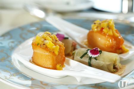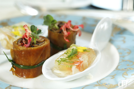 黃菊清酒阿拉斯加蟹肉凍(右)是中菜總廚莫師傅精心設計,利用不同地方、風味食材做中式點心,如阿拉斯加蟹肉,新鮮感滿滿。 素菜腐皮卷(左),外層香脆,餡料香甜。