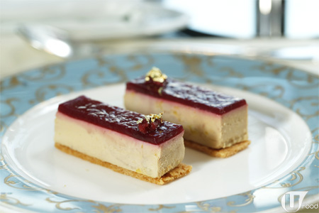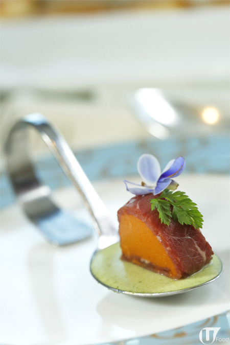 外型似甜點,實質係 鴨肝醬伴奶油包,面層棗紅色是梅味醬,底層係香濃 creamy 鴨肝醬及酥餅,酸咪梅味中和鴨肝膩感,好吃。