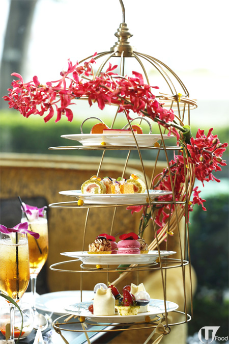 下午茶氣氛好有鋪排,走到酒店大堂,已見到色彩繽紛嘅鳥籠擺設,再走入酒廊窗邊位置,就有一排由天花板垂吊下來、布滿花花裝飾的鳥籠,垂到餐枱旁,鳥籠以繩子連結住枱邊固定好,唔會左搖右擺。望一望,原來唔止係裝飾,上面放滿下午茶美點!Suprised!