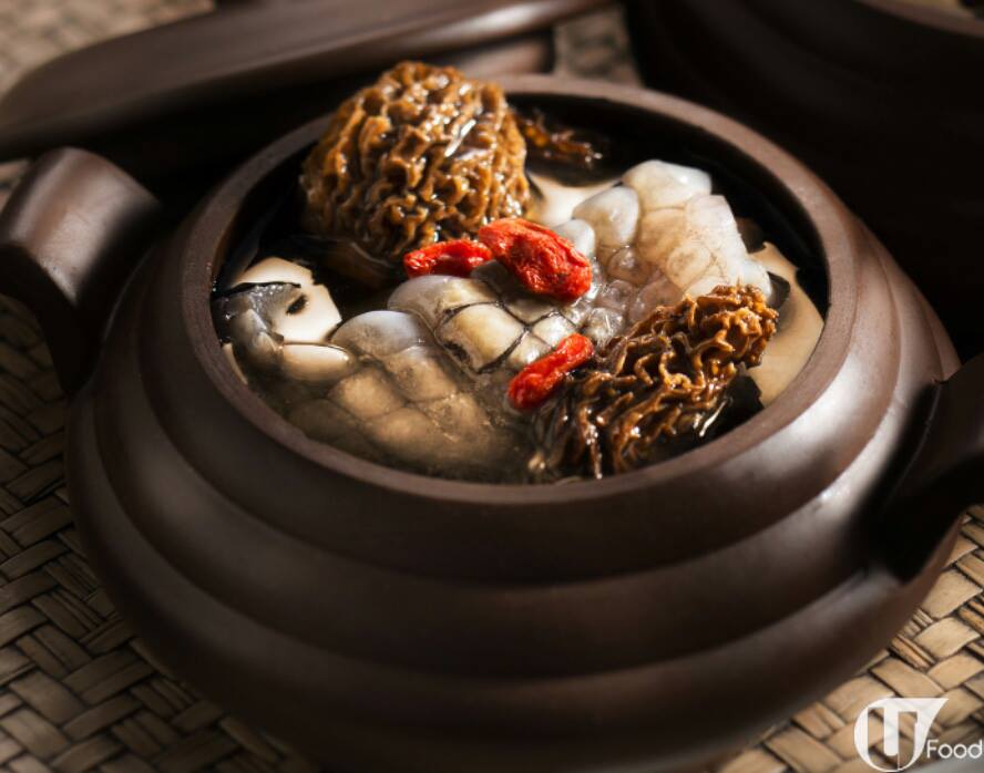 跟上是羊肚菌燉鱷魚掌湯。我在新加坡吃過紅燒鱷魚掌及尾巴,其鮮甜味美及膠質的豐富至今難忘。當午雖用來燉湯而非燜燒,但鱷魚掌的膠質仍是那麼黏口,加上羊肚菌的菌香及十多種藥材同燉的淡淡藥材香味,令我對這盅味鮮美而滋補的燉湯喝不釋口。
