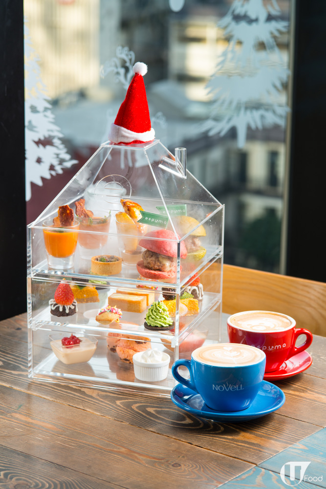 而呢個只需$228、供兩位用嘅超值下午茶,不但有外表,亦有內涵。透明屋仔每層都放滿美點,其中鹹食有自家製綠茶牛肉漢堡、自家製紅菜頭牛肉漢堡、番茄濃湯配脆煙肉、雜菌彩椒牛油撻等;甜點就有南瓜芝士餅、焦糖布丁撻、伯爵茶奶凍,同埋分別以聖誕老人帽子及聖誕樹造型登場的草莓朱古力蛋糕及綠茶慕斯奧利奧餅,賣相充滿節目氣氛,唔影番幾張靚相真係嘥晒。而除咗豐富美點,下午茶還包兩杯咖啡或茶,不過識飲一定飲咖啡,因為係用擁有60年歷史嘅西班牙品牌Cafés Novell優質咖啡豆沖調,味道特別香濃。