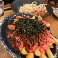 最近同朋友去荃灣食飯,原來餐廳有駐場歌 手,唱得好好聽呀😍! 丸久小山園抹茶鮮奶 熱,職員拉咗一個好可愛嘅狗仔喺上邊,我同朋友見到嗰陣時都即刻讚 ,好可愛呀😂 拉花好有心思呀味道都唔錯,抹茶夠濃。 西班牙風腸八爪魚新奥街良飯 $148日本櫻花蝦海鮮飲管粉 $118 2款主菜 個人較鍾意 飲管粉,比較特別 , 飲管粉係意粉係加粗版, 每條粉較食到有山葵味,入面仲有啲海鮮,好味 明太子薯條 🍟 $68,滿滿既明太子醬放係薯條上面 因為味道很好,所以要追加甜品,滿足第二個胃😌 「髒髒提拉米蘇」賣相創意十足,外觀看似「髒髒的」,實則味道極為美妙🥰 底層有濃郁的咖啡浸泡過的手指餅,加上柔滑的馬斯卡彭芝士,入口香醇,口感綿密👍 表面撒上厚厚的可可粉,與醇厚的巧克力醬相互交融,帶來視覺和味覺上的雙重享受 #我一定要飲咖啡