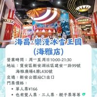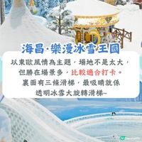 海昌.樂漫冰雪王國位於寶安海雅繽紛城,佔地4000多平米,整個樂園以東歐風為主題。樂園裡有多項冰雪遊樂設施,如3層樓高的滑梯、旋轉木馬、雪國列車、旋轉輪胎等;而自由活動場地更有人造飄雪,適合一家大細到訪。