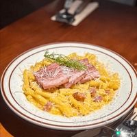 巴馬臣芝士和牛肉醬闊條麵味道酸甜開胃,闊條麵麵身有驚喜,反而比起捲捲意粉更有咬口。卡邦尼煙腩肉麻花捲粉賣相夠邪惡,有三塊厚切煙腩肉,肥瘦適中而且表面煎香過激發香氣,食落好滿足!
