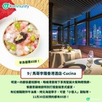 馬哥孛羅酒店坐擁醉人維多利亞港海景的 Cucina 餐廳,由意籍主廚 Andrea Delzanno 匠心打造精緻的平安夜及聖誕意式晚宴。六道佳餚包括烤和牛牛柳、白蘿蔔蓉、菠菜粉末,搭配酸甜解膩的蔓越莓汁,以及造型精緻的聖誕小鹿甜品。除夕意式盛宴則升級為七道正宗美食,各位可品嚐鮮美矜貴的普利亞生紅蝦薄片、牛油果、水牛芝士醬、貝魯加魚籽,以及嫩滑的焗智利鱸魚、海膽汁、青露筍。晚宴後更可參與除夕倒數派對,無限暢飲指定香檳及紅白酒,一起迎接2026年!酒店先正設有早鳥優惠,凡預訂12月24、25及31日的餐飲,於10月31日前預訂可享低至75折,11月30日前則享低至8折優惠。