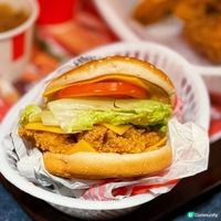 KFC全線分店推出堂食限定巨大五層巴辣雞腿包餐($88),漢堡包足足有齊5層爆脆巴辣雞扒、濃香芝士、番茄生菜,賣相非常震撼!套餐包括薯格及汽水,+$1再多一杯汽水,啱曬叫埋朋友一齊share~